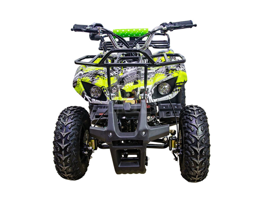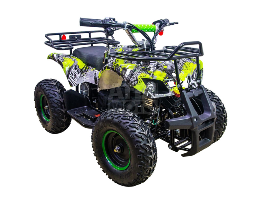Корпус защищён прочным пластиком, устойчивым к ударам и царапинам. Спереди установлен массивный отбойник, который помогает избежать повреждений при наезде на кусты или столкновении с препятствиями. Благодаря отсутствию выхлопных газов на ATV Classic 1000W можно кататься не только на улице, но и на закрытых площадках, а также хранить дома и не опасаться вредных испарений.